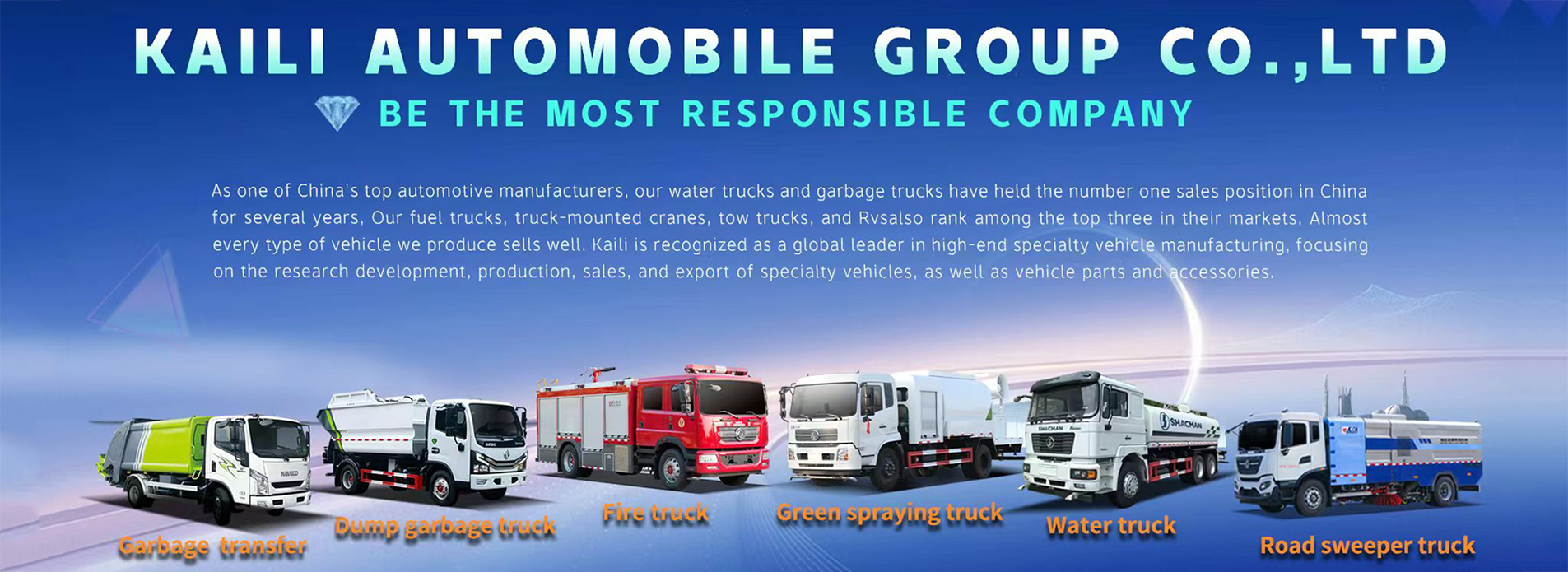 KAILI Automobile Group Company Limited Leading the market as the top seller of sprinkler trucks and the second largest seller of compactor garbage trucks in China, KAILI Automobile Group produces a range of models consistently ranking in the top 5 for sales nationwide. Renowned as the global leader in high-end special vehicle manufacturing, our company focuses on R&D and production of specialized vehicle products, as well as sales, import/export trade, and production of vehicle parts and accessories. We offer a comprehensive suite of services including scientific and technological applications, financial services, asset management, and industrial chain investment. Situated in Suizhou, Hubei, the epicenter of China's special vehicle industry, our state-of-the-art factory stands as a benchmark 5G intelligent facility. Equipped with modern production command centers, automated processing, painting, and assembly centers, as well as R&D and product exhibition centers, our facility ...